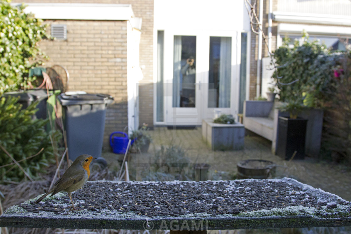 Roodborst in achtertuin; European Robin (Erithacus rubecula) in backyard